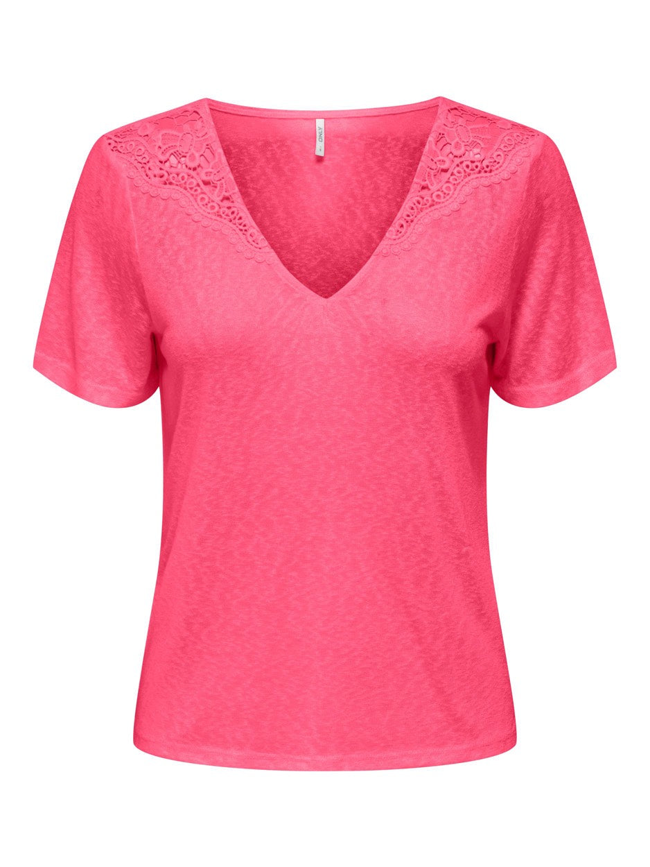 Deze roze top van het populaire merk Only is de perfecte aanvulling op je kledingkast! Het shirt heeft korte mouwen, een elegante v-hals en mooie kanten details. Hiermee creëer je een stijlvolle en vrouwelijke look.