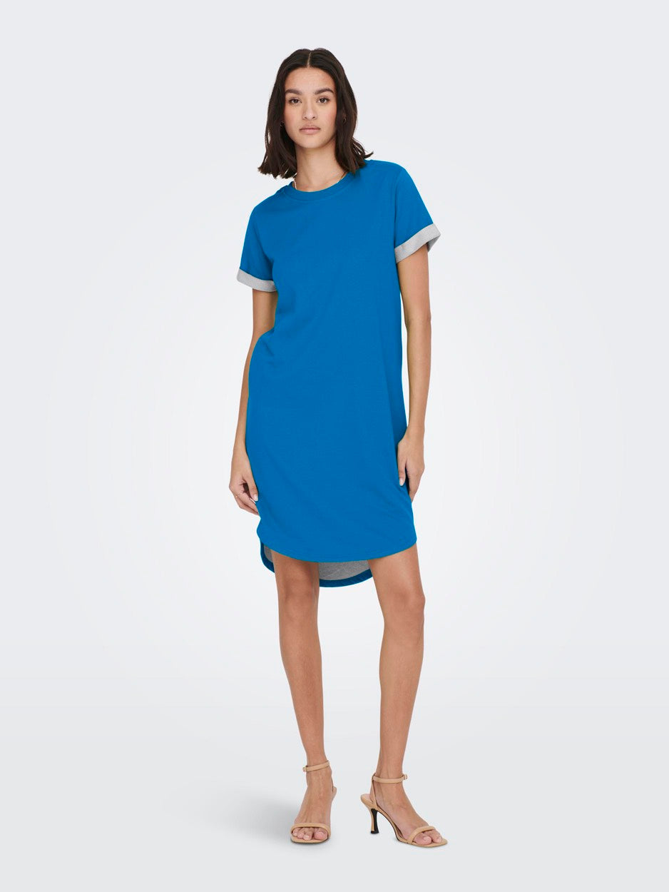 Deze korte damesjurk heeft een ronde hals en korte mouwen die zijn omgeslagen voor een extra speels effect. De jurk komt tot op de knie en heeft aan de achterkant een iets langere lengte dan aan de voorkant. Dit geeft de jurk een eigentijdse en trendy uitstraling.