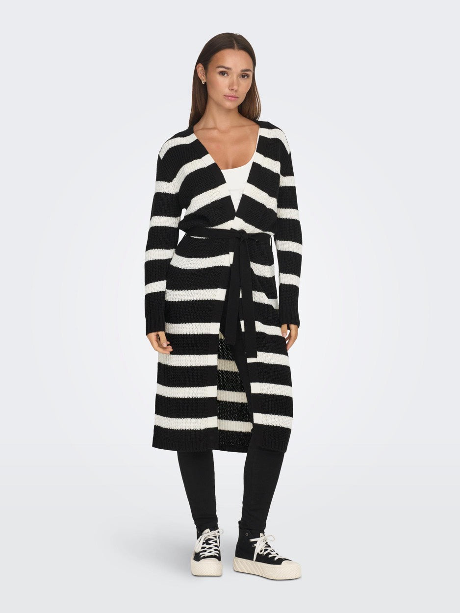 Met een klassieke V-hals en elegante lange mouwen is dit vest een tijdloos item in elke kledingkast. Het is uitgerust met een stijlvolle strikceintuur die je taille perfect zal accentueren. Het zwarte dessin met witte strepen geeft dit vest een moderne en trendy uitstraling, perfect voor de modebewuste vrouw.