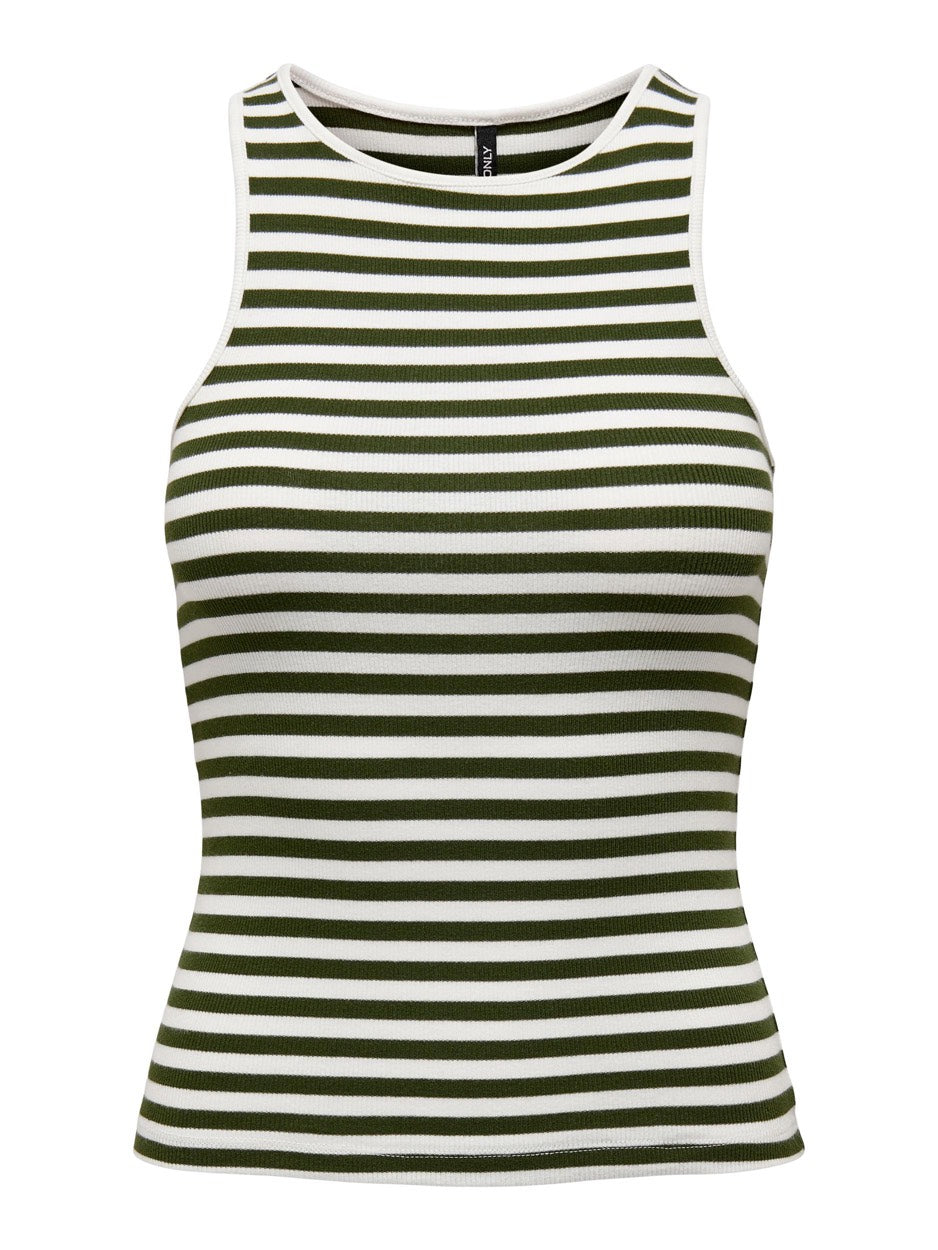 Deze prachtige singlet van het merk Only is een must-have voor elke kledingkast. De top heeft een opvallend groen dessin, wat zorgt voor een frisse en trendy uitstraling. Perfect voor de zomerse dagen! De hoge hals geeft de top een elegante touch en zorgt tevens voor een comfortabele pasvorm. Het streepeffect van de top zorgt voor een speelse twist en de mouwloze uitvoering maakt het perfect voor warm weer.