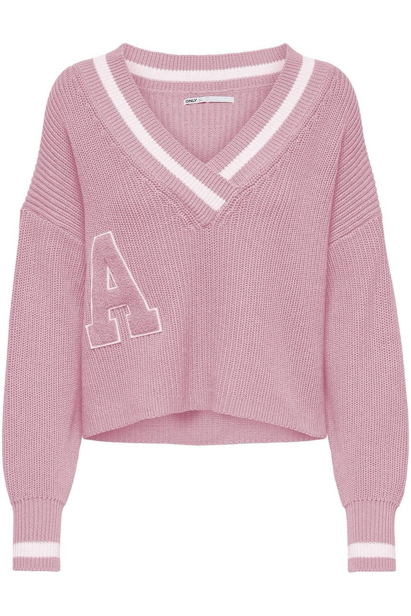 Deze lichtroze trui van Only is een must-have voor elke vrouw! De gebreide trui heeft een diepe V-hals en lange ballonmouwen, wat zorgt voor een trendy en vrouwelijke look. De verlaagde schoudernaden geven de trui een nonchalant tintje, perfect voor een casual outfit. De witte bies in de V-hals en bij de mouwen geeft een speelse touch aan de trui. Op de borst prijkt een grote opliggende A, wat zorgt voor een subtiel statement. Het model van de trui is kort en oversized, wat zorgt voor een comfortabele pasvorm en een trendy uitstraling. Gemaakt van 50% acryl en 50% katoen, is deze trui niet alleen fashionable maar ook heerlijk zacht en warm. Voeg deze trui toe aan je garderobe en creëer elke dag een stijlvolle en comfortabele outfit!